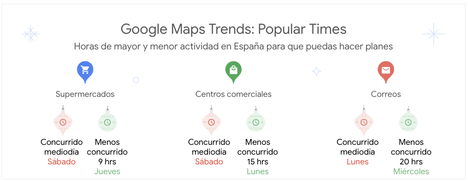 🥫 Supermercados. ¿Ya has hecho la lista de la compra con todo lo que necesitas para que tus invitados te hagan la ola? En toda España, el momento en que los supermercados y tiendas de barrio están más concurridos son los sábados al mediodía. Los ratos más tranquilos son las tardes de los lunes en Barcelona y Madrid, los domingos en torno a las 5 pm en Sevilla y los jueves a las 7 pm en Valencia.
