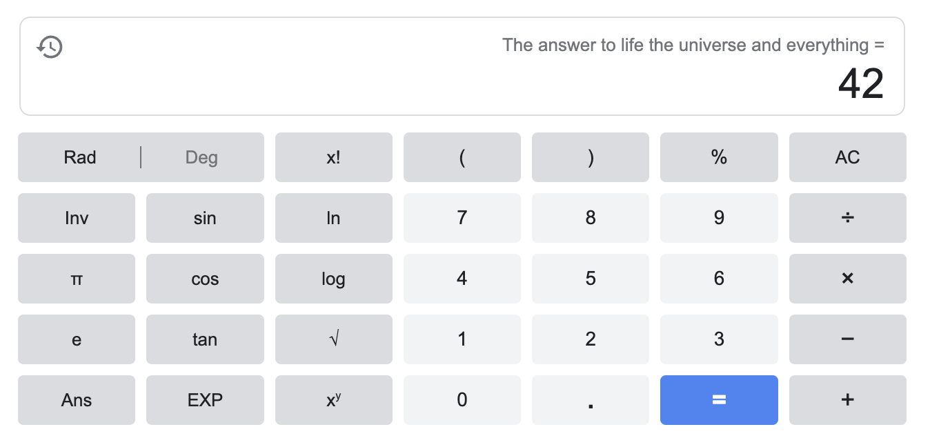 A lo largo de los años, el equipo de Google ha desarrollado un montón de funciones ocultas —incluso juegos— en la Búsqueda. Se las conoce como huevos de Pascua. En 2003, uno de nuestros primeros huevos de Pascua dio la respuesta al problema de La vida, el universo y todo los demás. Desde entonces, millones de personas han visto sus páginas torcidas, han dado vueltas de campana, han entrado en un divertido bucle recursivo y han celebrado grandes momentos de la cultura pop.