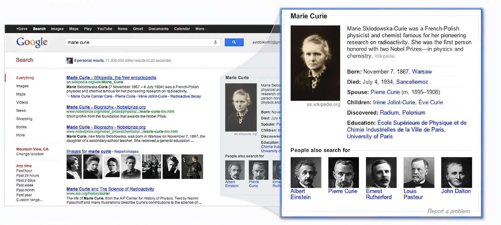 Aquel año presentamos el Gráfico del conocimiento, una vasta recopilación de personas, lugares y cosas… y de sus relaciones. Objetivo: conseguir respuestas rápidas de manera más sencilla. La primera aplicación de este Gráfico de conocimiento fueron los paneles de conocimiento, una instantánea rápida con información sobre celebridades, ciudades, equipos deportivos, etc.