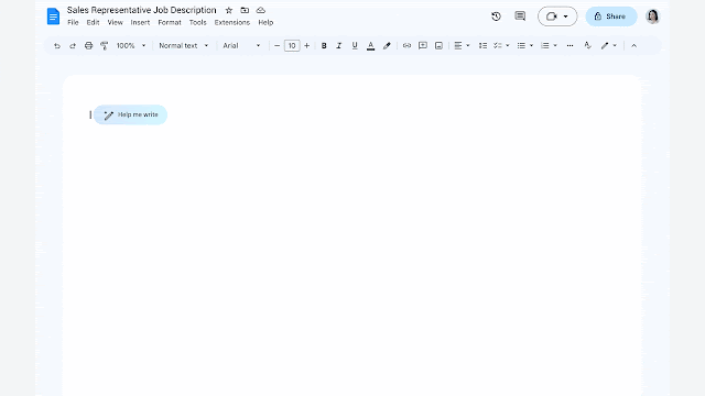 A los usuarios les encantan Smart Canvas, porque una simple mención puede ahorrarles horas de trabajo al mantener a los equipos focalizados y colaborando en el documento en el cual ya se encontraban trabajando. Ahora, estamos integrando estas funcionalidades en la nueva experiencia de escritura asistida en Docs. En este sentido, si estás escribiendo una descripción de trabajo, Duet AI no solo te ayudará a escribir el contenido, sino también a incluir chips inteligentes para incorporar información adicional como la ubicación y el estado, y variables para detalles que te gustaría personalizar, como el nombre de tu empresa por ejemplo. Esto te permitirá pasar del concepto al trabajo terminado de manera más rápida, sin tener que abandonar el documento.