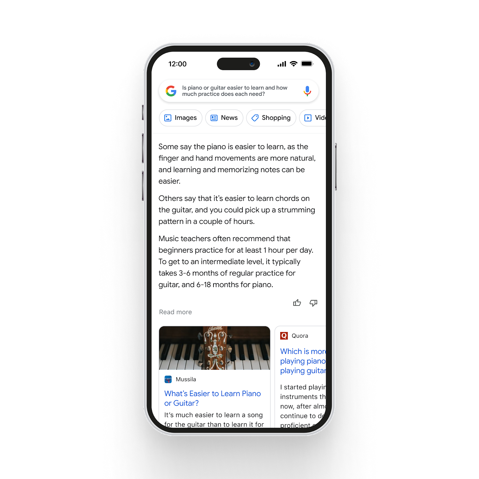 La IA puede resultar muy útil para sintetizar ideas y ayudar a responder preguntas que no tienen una sola respuesta correcta. Próximamente, el Buscador de Google contará con funciones asistidas por IA capaces de procesar información compleja —con múltiples perspectivas— y presentarla en formatos fáciles de absorber. Servirán para entender con rapidez cuál es el panorama general sobre una cuestión y sacarle más partido a internet. Por ejemplo, para buscar perspectivas adicionales, como blogs de gente que toca tanto el piano como la guitarra, o para profundizar más en alguna temática, como cuáles son los pasos para empezar a tocar un instrumento. En breve empezaremos a incorporar estas nuevas funciones asistidas por IA al Buscador de Google.